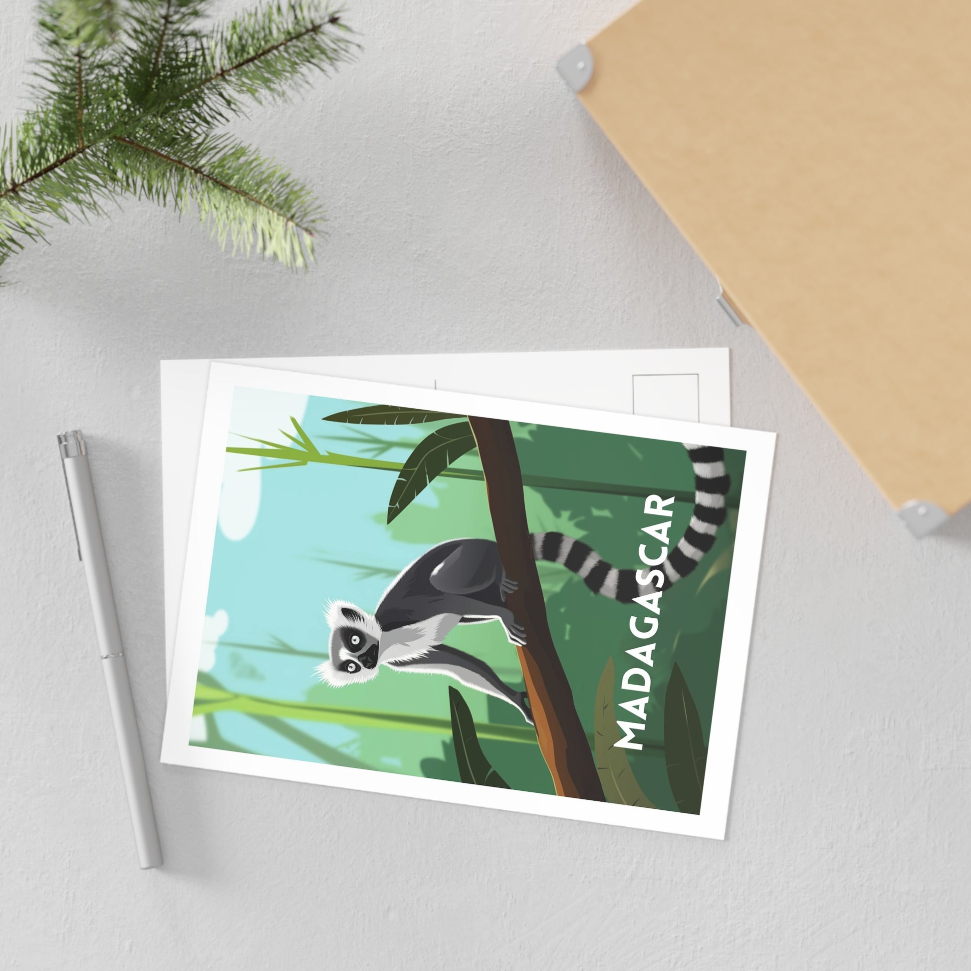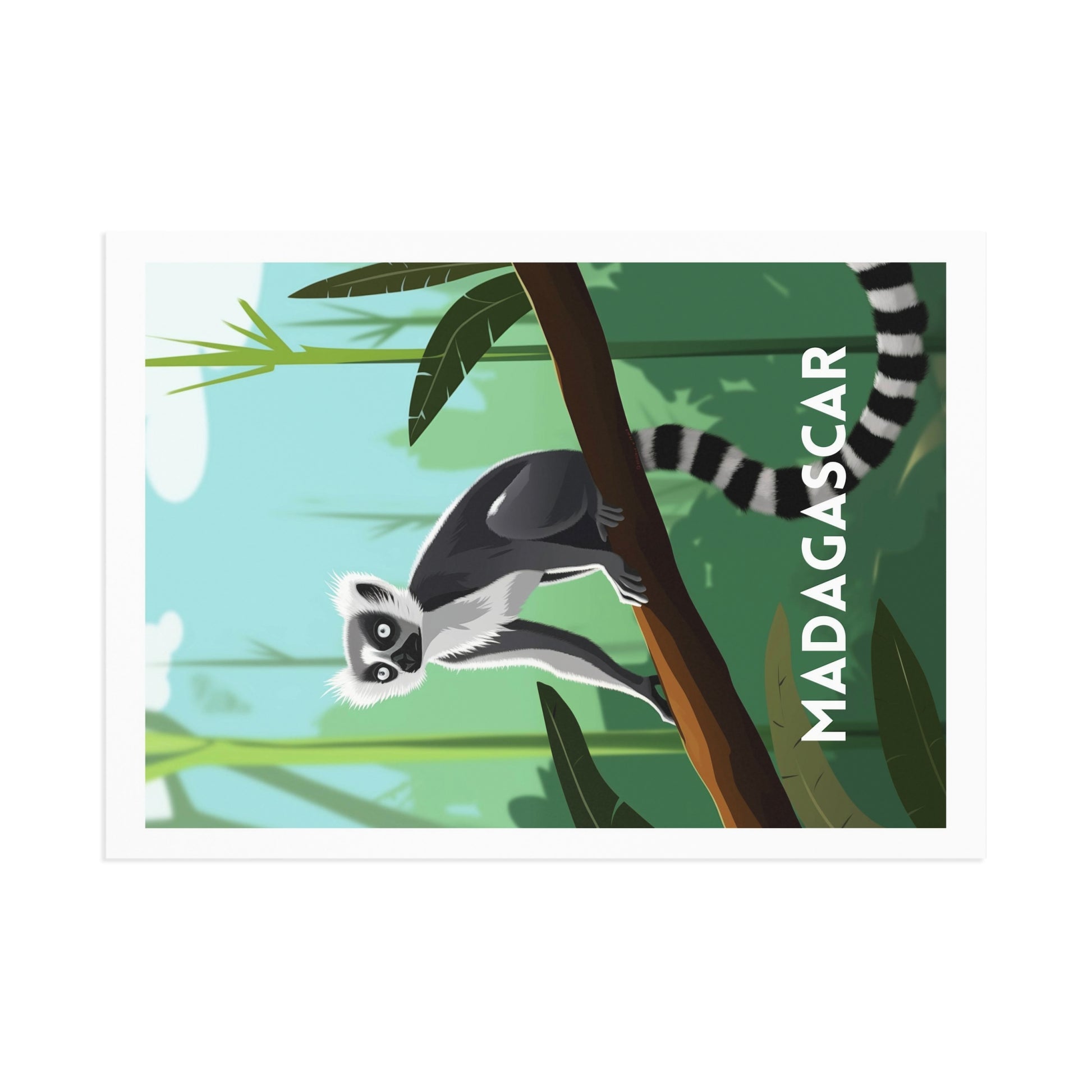 This art postcard showcases the Ring-tailed Lemur, or Lemur Catta — an iconic symbol of Madagascar's wildlife. Instantly recognizable by its long striped tail, it embodies the richness and uniqueness of the island’s biodiversity.