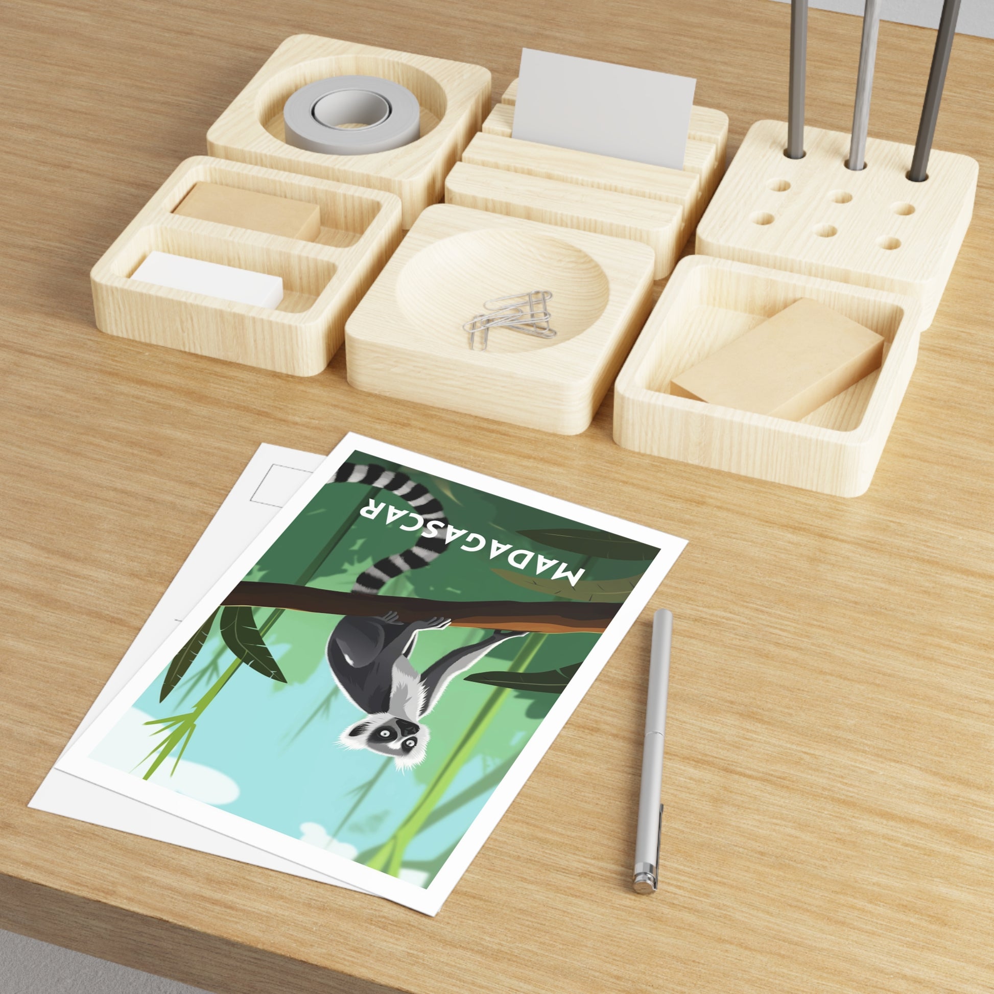 Cette carte postale artistique met en lumière le Maki Catta, célèbre lémurien à queue annelée, symbole emblématique de la faune malgache. Reconnaissable entre mille avec sa longue queue rayée, il incarne toute la richesse et la singularité de la biodiversité de l’île.