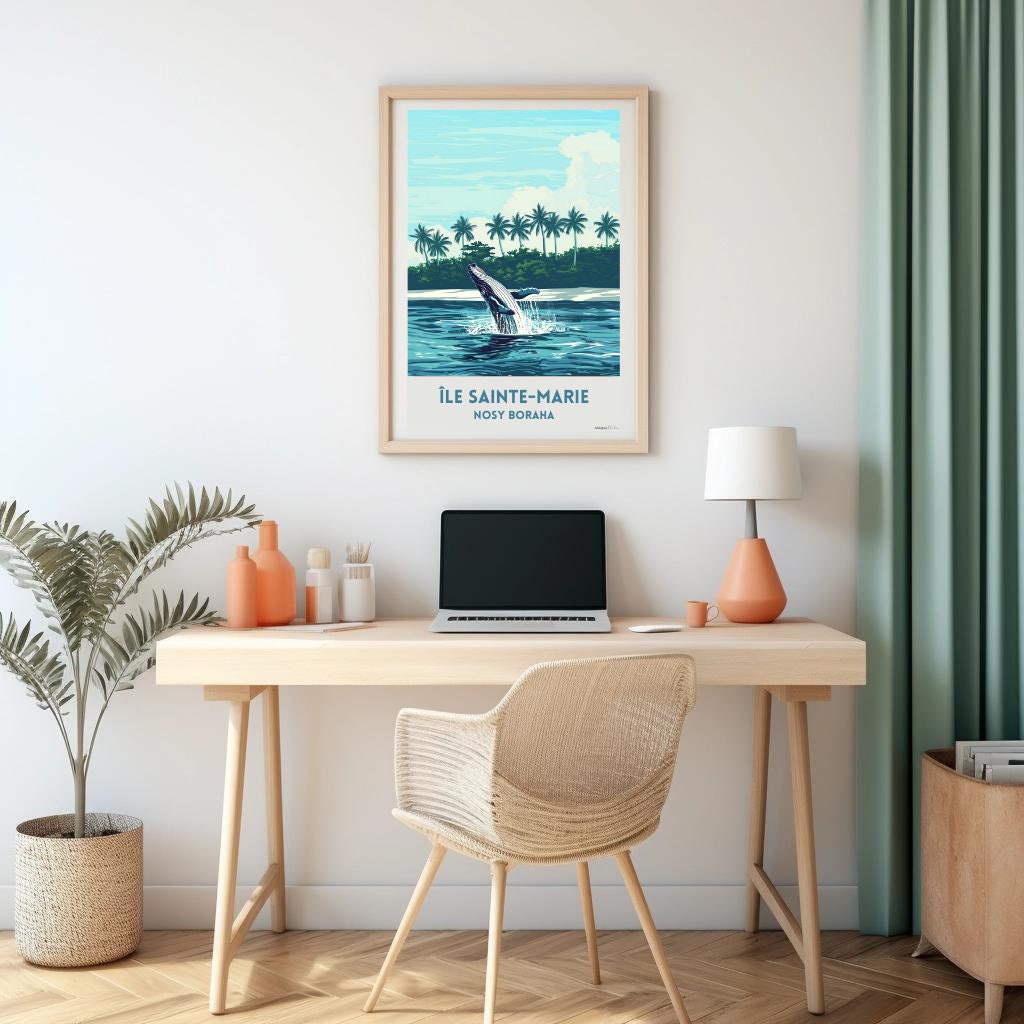 Une affiche de voyage au style vintage mettant en valeur la magnifique île de Sainte-Marie, à Madagascar, conçue avec passion par une graphic designer malgache. Son design rétro et coloré ajoutera une touche exotique à votre décoration intérieure. Parfaite pour les amateurs d'art et les voyageurs passionnés, cette affiche vous invite à découvrir les paysages uniques de Sainte-Marie, Madagascar, réputée pour ses plages de sable blanc, ses eaux cristallines et ses rencontres magiques avec les baleines à bosse pendant la saison des migrations.